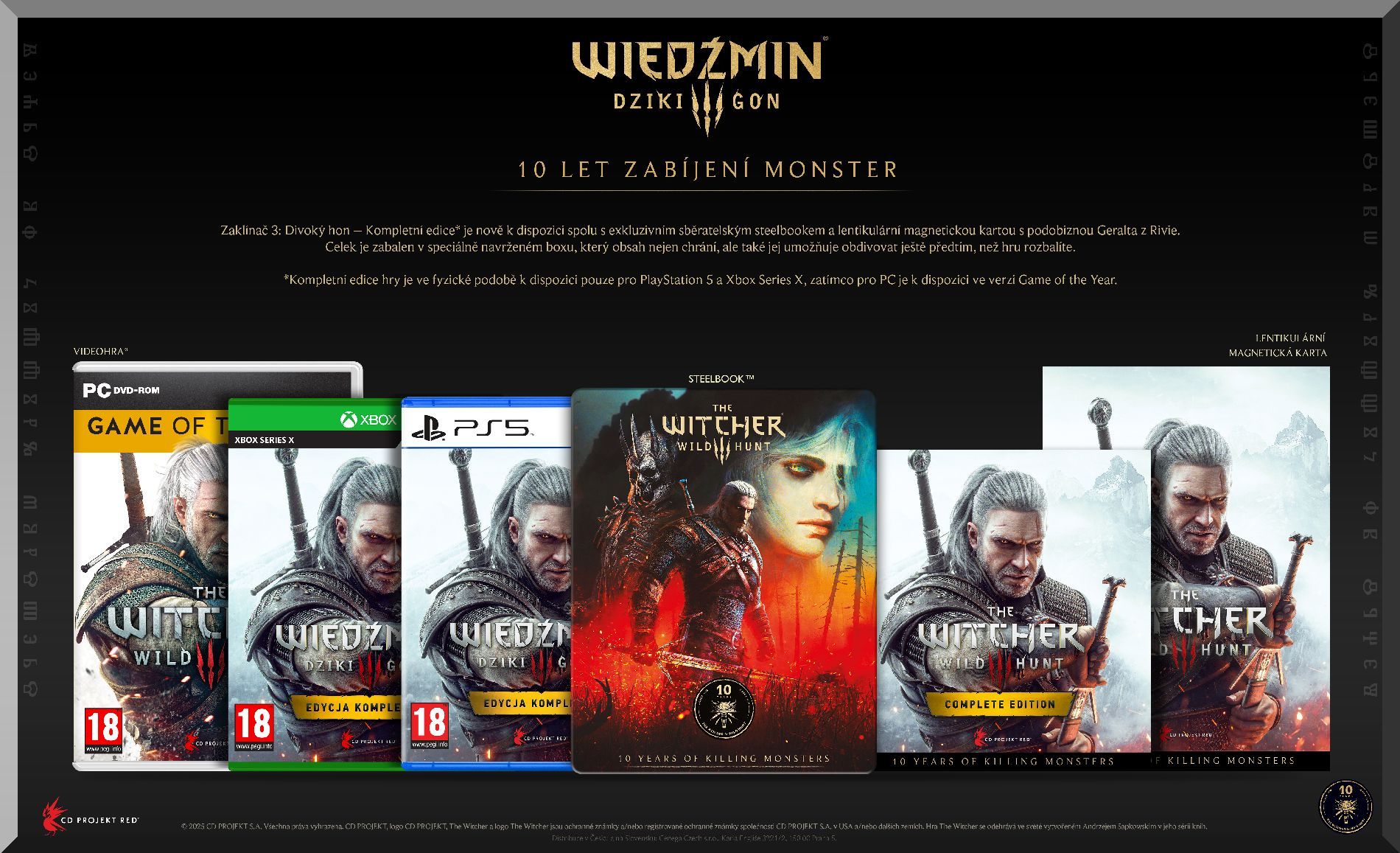 Zaklínač 3. Divoký Hon, kritikou i hráči oslavované RPG mistrovské dílo, se vrací v ultimativní a kompletní edici u příležitosti svého 10. výročí. Ujměte se role profesionálního zaklínače, Geralta z Rivie, a vydejte se do masivního a živoucího otevřeného světa plného monster, magie a morálních dilemat. Tato výroční edice je dokonalou příležitostí, jak se ponořit do celého příběhu a zažít Geraltovo legendární dobrodružství i s veškerým dodatečným obsahem.