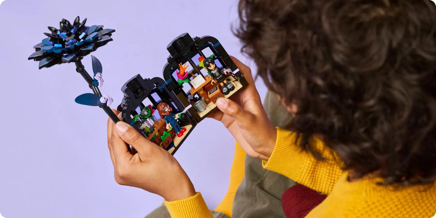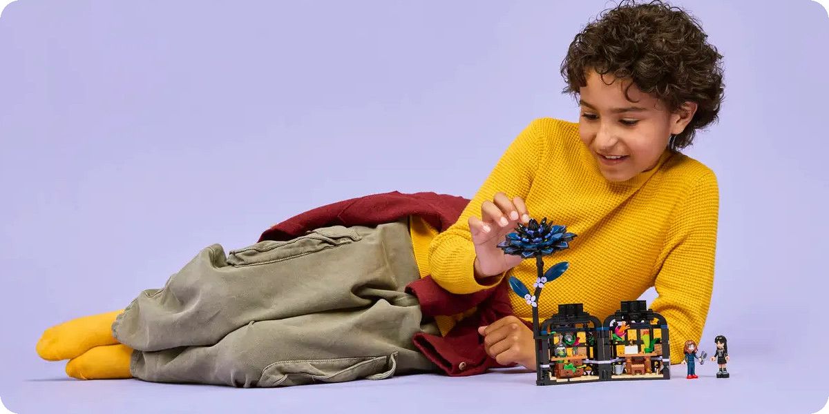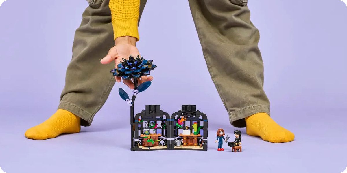 Na první pohled vidíte černou jiřinu z kostek LEGO®, která slouží jako zámek pro vázu. Jakmile květinu odejmete a vázu odemknete, odhalíte propracovaný interiér – miniaturní zimní zahradu s prosvětlenými okny a učebnu uvnitř. V ní najdete odnímatelné lavice, stoličku a další doplňky, které inspirují k vyprávění příběhů. Tento propracovaný mechanismus nabízí nekonečné možnosti hraní a rozšiřuje sběratelskou hodnotu modelu.