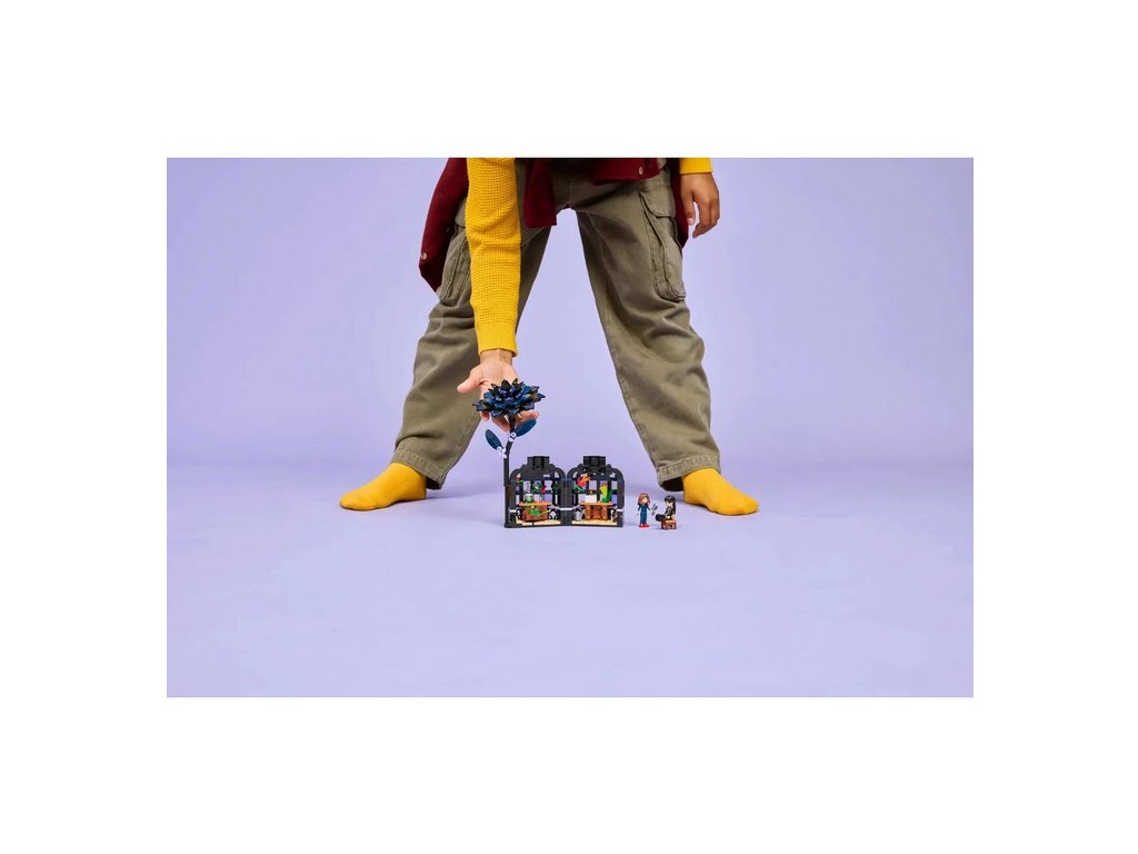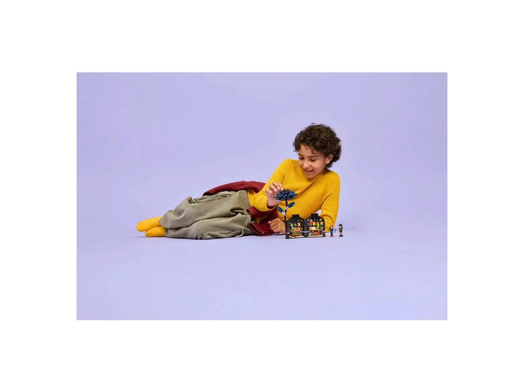 Na první pohled vidíte černou jiřinu z kostek LEGO®, která slouží jako zámek pro vázu. Jakmile květinu odejmete a vázu odemknete, odhalíte propracovaný interiér – miniaturní zimní zahradu s prosvětlenými okny a učebnu uvnitř. V ní najdete odnímatelné lavice, stoličku a další doplňky, které inspirují k vyprávění příběhů. Tento propracovaný mechanismus nabízí nekonečné možnosti hraní a rozšiřuje sběratelskou hodnotu modelu.